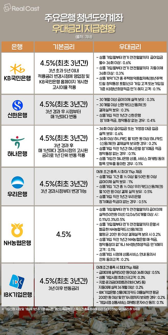 한편, 신규로 청년도약계좌를 신청하려고 준비 중인 청년이라면 보다 높은 우대금리를 적용받을 수 있는 은행을 찾아 가입신청을 하는 것이 향후 자산형성에 유리할 수 있습니다. 이에 리얼캐스트가 각 은행별 우대금리 조건에 대해 살펴봤습니다.