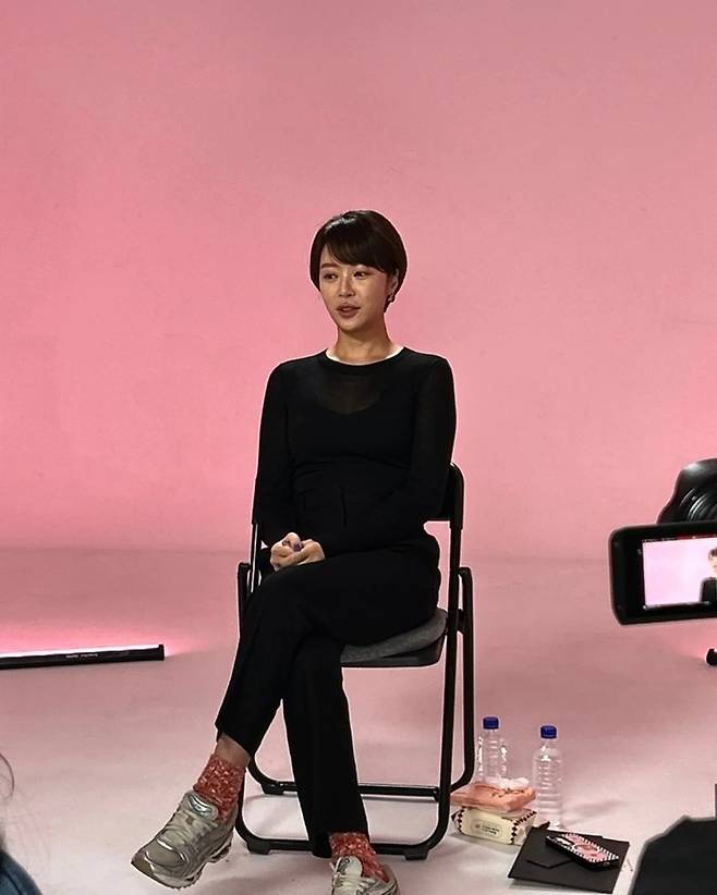 스튜디오 촬영 현장에서 황정음은 세련된 올블랙 코디네이션으로 프로페셜한 매력을 발산하고 있다. 시스루 디테일이 가미된 블랙 니트 톱은 모던한 감각을 더하며, 스키니 팬츠와의 매치로 슬림한 실루엣을 완성했다. 패턴 양말과 스니커즈의 조합은 포멀한 룩에 캐주얼한 포인트를 가미해 젊은 감각을 연출하고 있다.