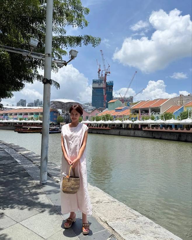 황정음은 싱가포르 클라크 키 워터프론트에서 청순한 화이트 원피스로 여름 휴양지 패션을 완벽하게 연출하고 있다. 레이스 디테일이 돋보이는 맥시 원피스는 시원한 소재감으로 열대 기후에 적합한 선택을 보여준다. 라탄 소재의 원형 백과 스터드 장식 샌들로 리조트 룩의 완성도를 높이며, 자연스러운 헤어 스타일링으로 편안하면서도 세련된 분위기를 자아내고 있다.