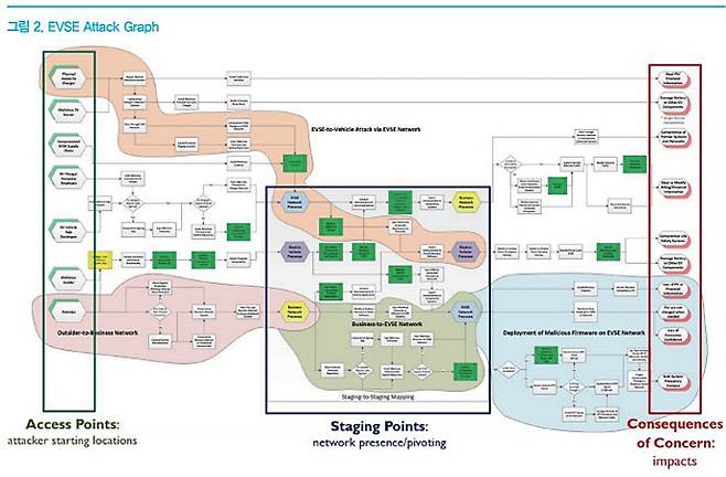 EVSE는 국가 전력망과 직접 연결되며, 스마트 그리드와 연계되어 전력 부하를 조절하는 역할을 한다. 그러나 해커가 충전 네트워크를 해킹할 경우, 전력망을 직접적으로 교란하는 공격이 가능하다. 예를 들어, 해커가 대량의 EVSE를 원격 조작하여 특정 시간에 동시 충전을 유도하면 전력망에 급격한 부하가 발생할 수 있으며, 반대로 모든 충전을 강제 중단하면 전력망 운영이 불안정해질 수 있다. 이러한 공격은 국가 전력망의 균형을 무너뜨려 특정 지역에서 대규모 정전(Blackout)이 발생할 가능성을 높인다.
