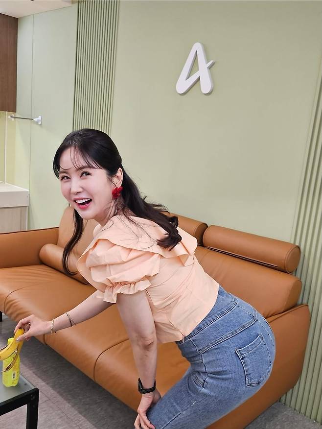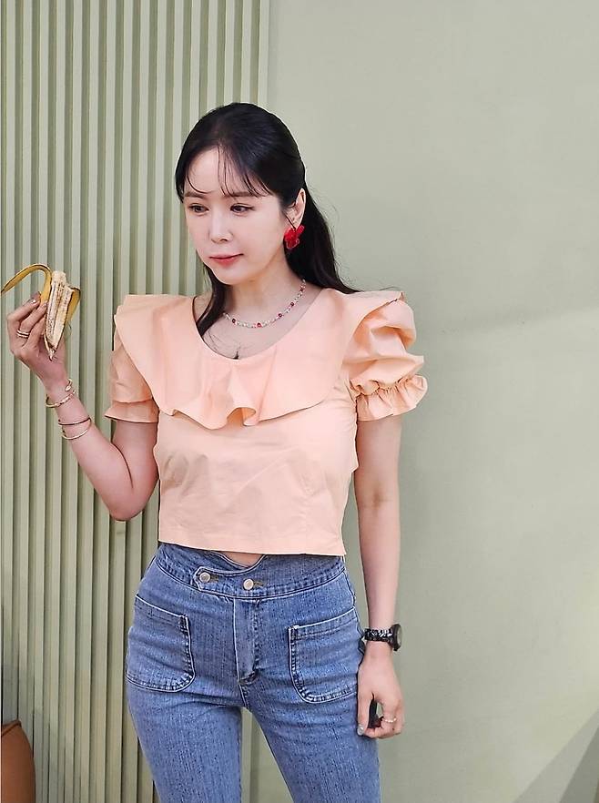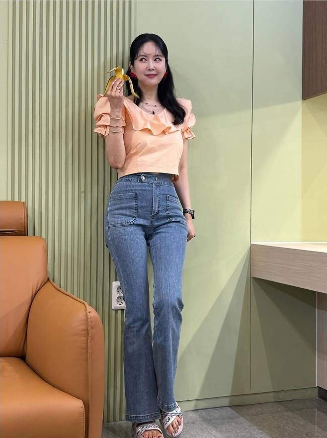 장영란은 과감한 프릴 디테일이 돋보이는 복숭아빛 크롭 블라우스에 버튼 포인트가 유니크한 하이웨이스트 데님 팬츠를 매치해 발랄하면서도 세련된 분위기를 완성했습니다.