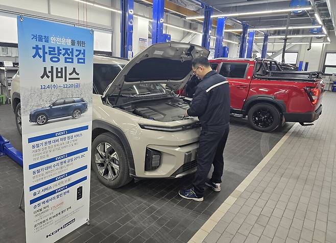 [오토헤럴드 정호인 기자] KG 모빌리티가 '동절기 운행 대비 차량점검 서비스'를 실시한다. 차량점검 서비스는 4일부터 20일까지 3주간 전국 318개 서비스 네트워크에서 KGM 전 차종(대형 상용차 제외)을 대상으로 실시한다.