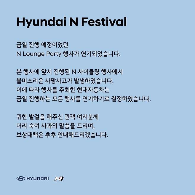 현대차는 사고 직후 이날 N 사이클링 행사는 물론 유명 연예인 공연 등이 예정된 ‘N 라운지 파티' 모두를 취소했다. 이날 사망 사고와 함께 주말 있었던 원메이크 레이스 대회인 N 페스티발 전반에도 레이스 진행과 시상 등에 차질이 발생하면서 각종 불만이 쏟아져 나놨다.