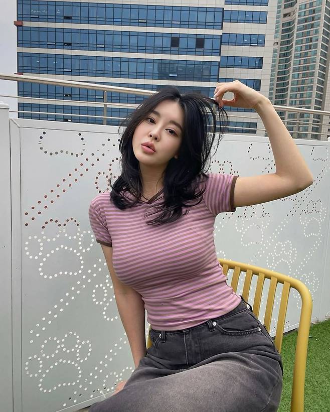 이번 룩의 핵심은 라일락 컬러의 스트라이프 반팔 티셔츠다. 상체에 핏되게 감기는 실루엣이 그녀의 볼륨감을 강조하며, 잔잔한 가로 줄무늬는 군더더기 없이 깔끔한 인상을 준다. 라운드넥 디자인과 짧은 소매는 전체적으로 경쾌한 무드를 완성하며, 여름 시즌에도 부담 없이 스타일링 가능한 아이템으로 손꼽힌다.