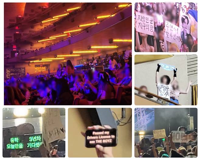 | ▲ 공식 응원도구인 조명이 들어오는 메가폰외에 저마다의 개성이 담긴 플랜카드나 응원도구를 들어보이고 있다. 더보이즈 공연을 보러오기 위해 운전면허를 땄다는 팬의 문구가 재밌다. |