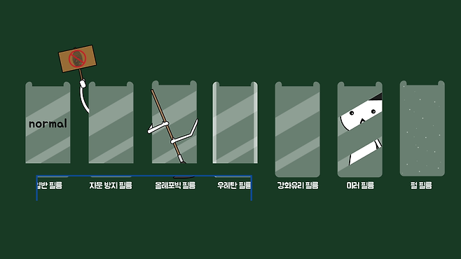 액정보호필름에는 일반필름과 지문방지필름, 올레포빅필름, 우레탄필름, 강화유리, 미러필름, 펄필름 등 다양한 종류가 있습니다. 이들 필름은 스마트폰의 자체 액정과는 다른 소재이므로 액정보호필름을 붙이지 않은 상태에서 스마트폰을 사용할 때와는 느낌이 많이 다릅니다.