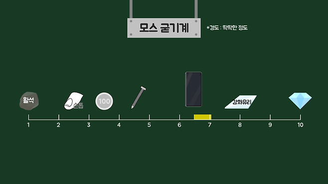 스마트폰 액정의 경도(딱딱한 정도)는 약 6.5~7 정도이고, 경도의 정도를 비교한 위의 그림과 비교해서 보면 어느 정도의 수준인지 느낌이 올 겁니다. 경도를 비교해서 봤을 때 일상생활에서 사용하는 물품 때문에 액정이 긁힐 일은 웬만하면 없어 보입니다. 문제는 경도가 7 이상인 경우가 주변에 많은 상황입니다.
