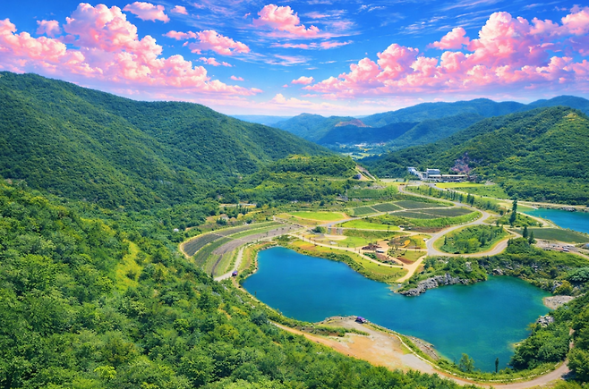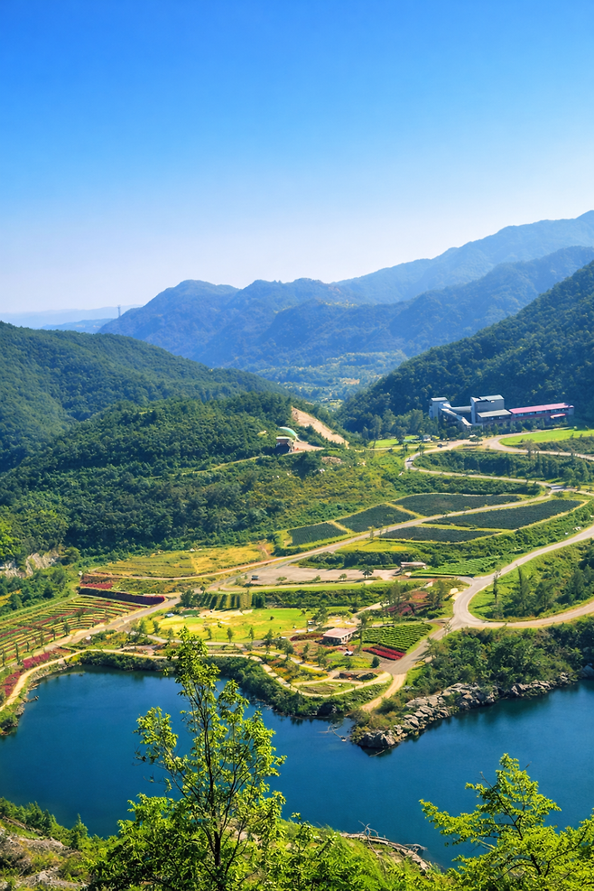 부지 규모는 약 107만㎡. 숫자보다 더 놀라운 건 공간이 주는 압도감입니다. 사방을 감싸는 최대 270m 높이의 석회석 절벽이 병풍처럼 서 있고, 그 아래로 청옥호와 금곡호가 맑은 물빛을 드러냅니다.