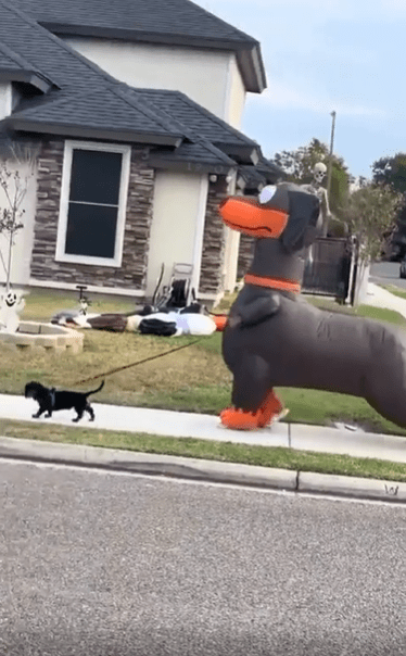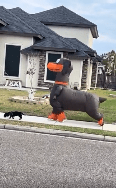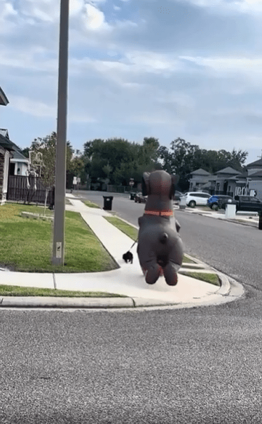그제야 알게 됩니다. 이건 풍선 인형이 아니라, 강아지 풍선 코스튬을 뒤집어쓴 사람이 실제로 네 발 자세로 걷고 있는 것이란 걸. 심지어 땅을 짚고 움직이는 팔과 다리는 그 형태를 유지한 채 정말 동물처럼 움직이고 있고, 줄은 그 손에 잡혀 있어요. 즉, 사람이 인형처럼 위장한 채, 실제 강아지를 산책시키는 상황인 거죠.
