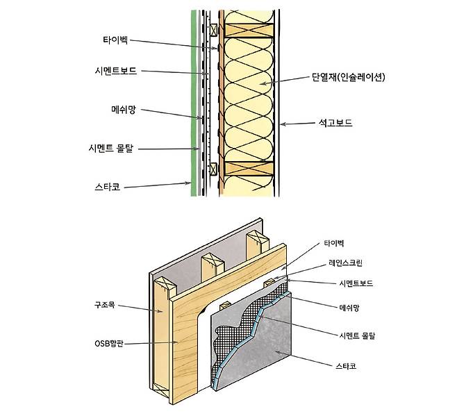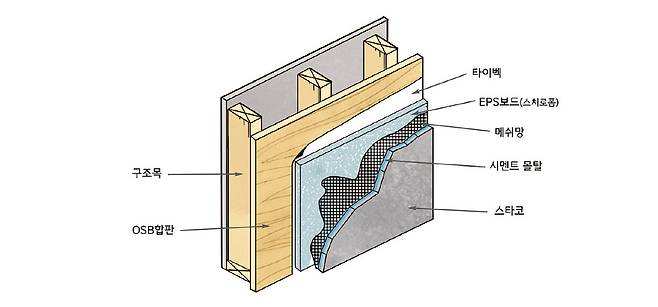 다음 그림이 필자가 추천하는 방식이다. OSB 합판 + 타이벡 + 시멘트보드(6~8T) + 메쉬망 + 초벌 미장 + 스터코 미장 순이다. 벤트(Vent)가 있어 건강한 구조목 상태를 유지할 수 있다.