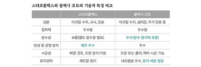 위 표를 요약하면 미국 제품인 스터코플렉스는 탄성이 우수하지만, 가격이 높다는 단점이 있고 한국 제품인 플렉시 코트는 비교적 합리적인 금액에 방수성도 갖추고 있다고 말할 수 있다.