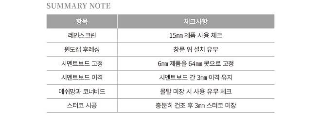 * 벽체 배수 설계 필수 : 목조주택의 경우 내부 결로 및 수분 침투 방지를 위해 레인스크린 확보