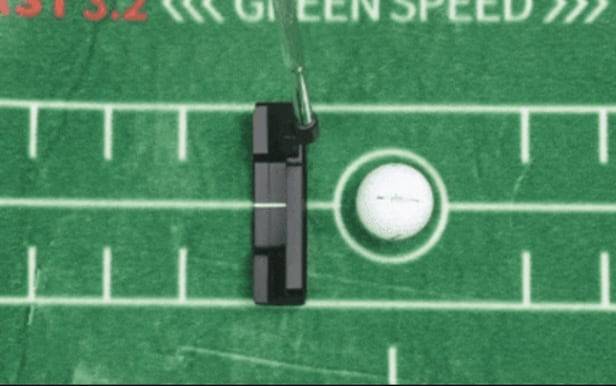 위에서 내려다보는 헤드 가운데에 골프공과의 정렬을 확인하기 위한 ‘얼라인먼트 라인(정렬 선)’이 있어 정확한 퍼팅을 돕습니다. 한 번의 퍼팅으로 홀인시킵니다.