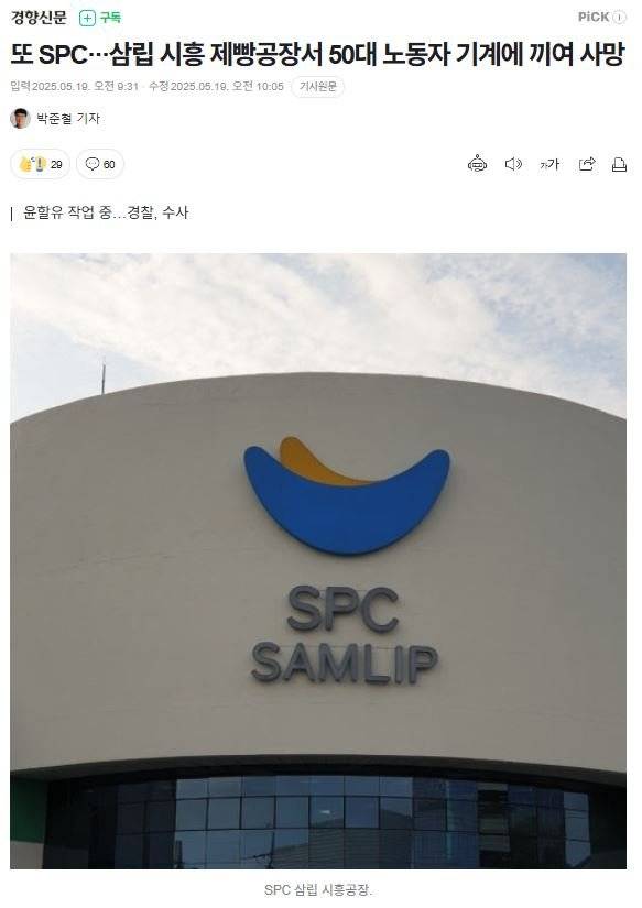 경기 시흥경찰서는 19일 오전 3시쯤 시흥에 있는 SPC삼립 시화공장에서 50대 여성 노동자 A씨가 작업 중 기계에 끼여 사망했다고 밝혔다. 사고는 A씨가 기계에 윤활유를 뿌리는 작업을 하던 중 발생한 것으로 파악됐다.
