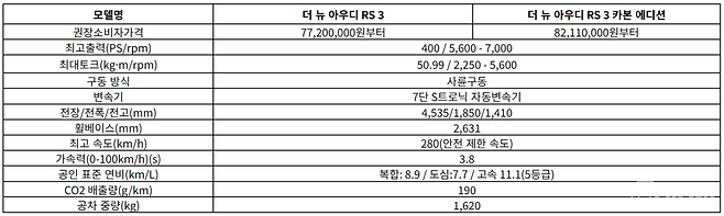 '더 뉴 아우디 RS 3'의 가격은 77,200,000원, '더 뉴 아우디 RS 3 카본 에디션'은 82,110,000원(부가세 포함, 개별소비세 3.5% 기준)이다.