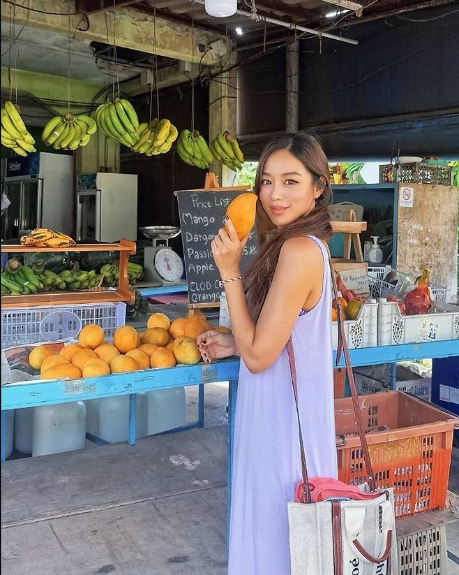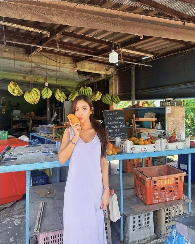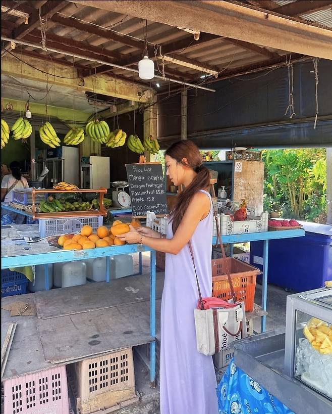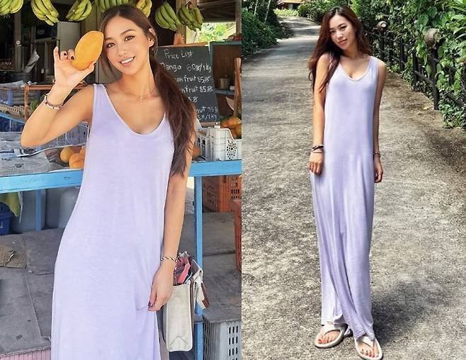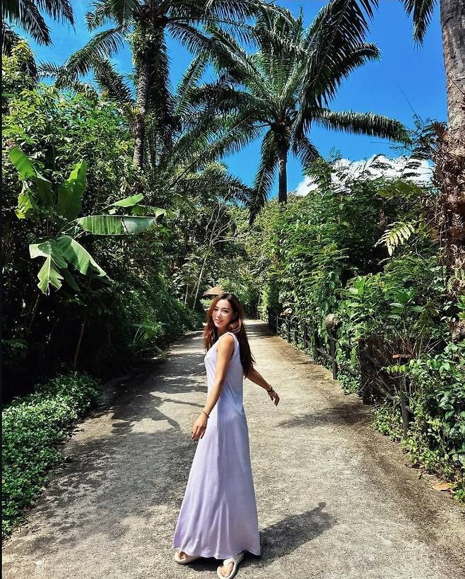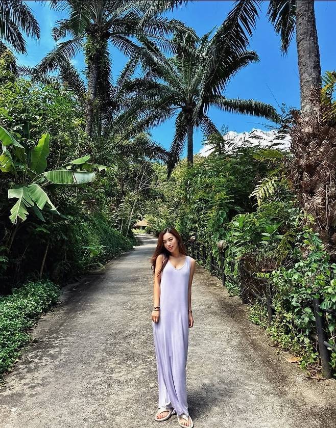 김희정은 태국의 이국적인 풍경을 배경으로 넉넉한 핏의 롱 원피스를 입고 여유로운 분위기를 자아냈습니다.