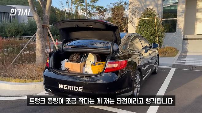또 다른 단점은 트렁크 용량이 조금 작다는 단점이라고 생각합니다. 전기모터가 트렁크 밑에 들어가다 보니까 2.4 가솔린이나 3.0 가솔린 보다는 조금 더 작고 높아서 좀 불편하실 분들이 많을 거라 생각합니다.