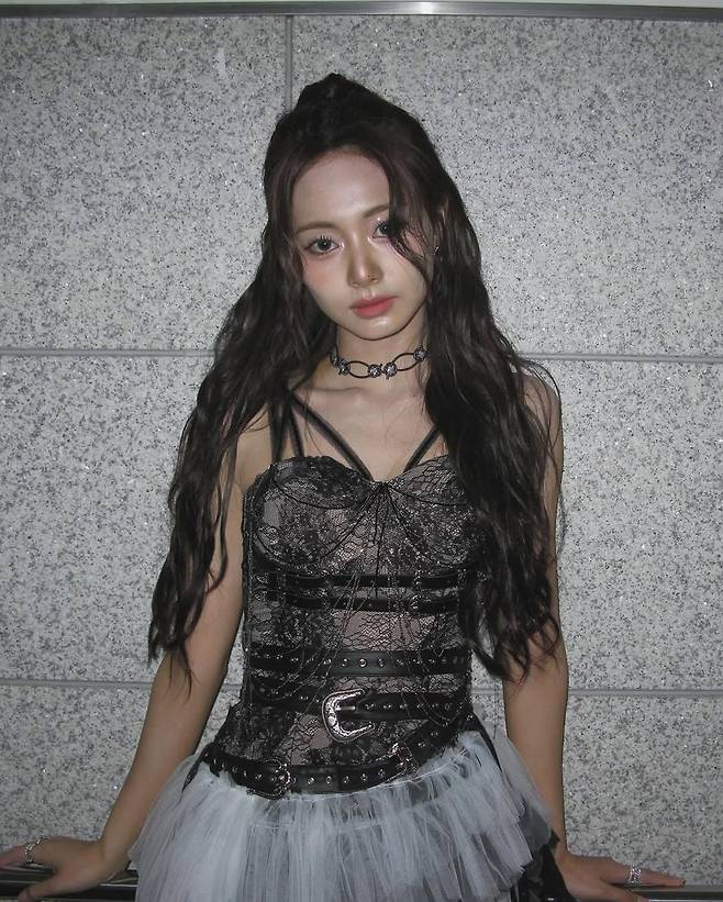 사진 속 쯔위는 블랙 레이스 코르셋과 튤 스커트를 믹스한 하이브리드 스타일의 착장을 선보였다. 실루엣을 강조하는 레이스업 디테일과 스터드 벨트 장식이 시크하면서도 페미닌한 분위기를 자아냈고, 하늘하늘한 그레이 톤 튤이 믹스되어 무거운 고딕 무드에 은은한 러블리함을 더했다. 이와 함께 네크라인을 감싸는 블랙 초커와 긴 웨이브 헤어스타일이 고딕 무드의 정점을 찍으며 전체적인 스타일의 완성도를 높였다.