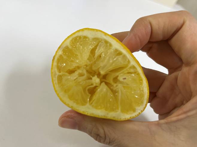 레몬을 반으로 가른 후 즙을 내어 손에 바릅니다. 레몬이 없다면 레몬즙 등 시판 제품을 활용해도 됩니다. 레몬은 산이 많기 때문에 소독 효과는 물론 악취 제거에도 도움이 됩니다.