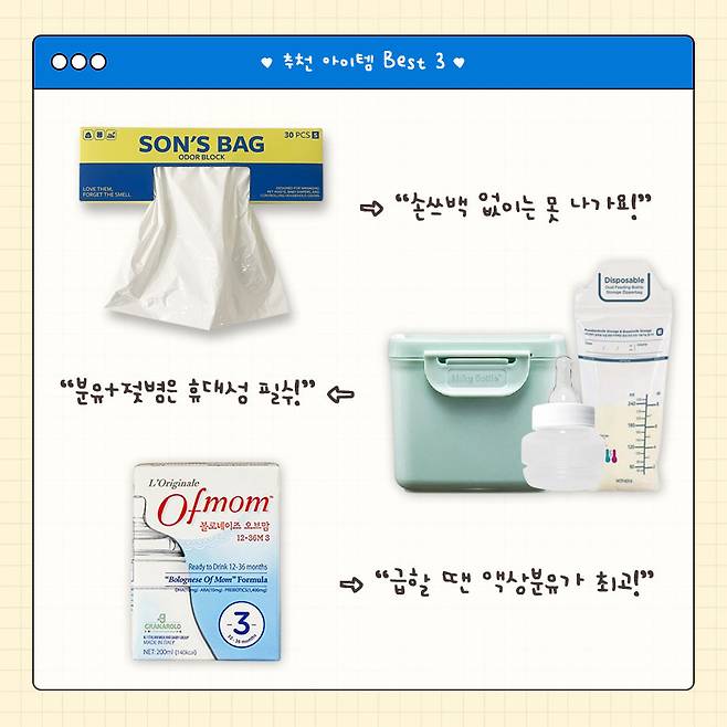 기저귀 가방 속 외출 템 Best3를 소개할게.