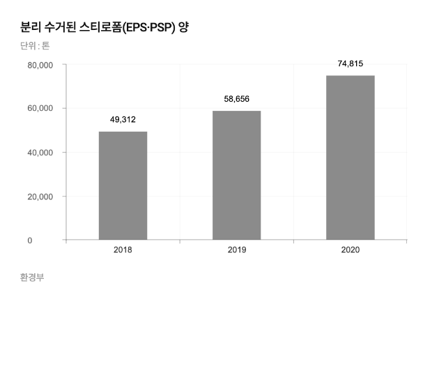 스티로폼은 안 그래도 많이 사용됐는데 코로나19로 포장이 늘며 이용량이 급증했습니다. 환경부에 따르면 2020년 분리수거된 스티로폼은 7만4,815톤으로, 2019년(5만8,656톤)보다 1만6,000톤가량 증가했습니다. 분리수거된 양만 이 정도이니 실제 발생량은 더욱 많을 것으로 추정됩니다.