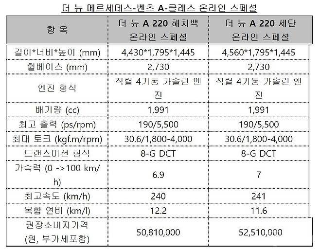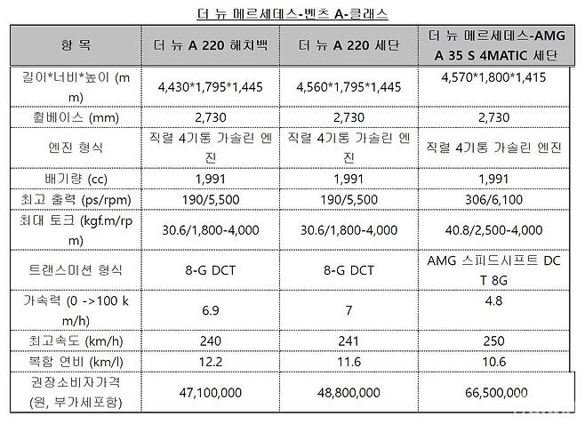 메르세데스-벤츠 코리아㈜(대표이사 사장 마티아스 바이틀)가 콤팩트 해치백 A-클래스의 4세대 부분변경 모델 '더 뉴 메르세데스-벤츠 A-클래스 해치백'과 콤팩트 세단 A-클래스 세단의 첫 부분변경 모델 '더 뉴 메르세데스-벤츠 A-클래스 세단'의 라인업과 가격을 공개하고, 이달 국내 공식 판매를 시작한다. A-클래스는 안전성, 효율성, 젊은 감각의 디자인을 앞세운 모델로, 지난 2019년 4세대 해치백 모델이 국내에 공식 출시된 바 있으며, 기존 해치백으로만 구성됐던 A-클래스 라인업에 새롭게 도입된 최초의 세단으로 A-클래스 세단이 지난 2020년 국내에 출시된 바 있다. 이 두 모델은 이번에 각각 '더 뉴 A-클래스 해치백'과 '더 뉴 A-클래스 세단' 부분변경 모델로 함께 돌아왔다.