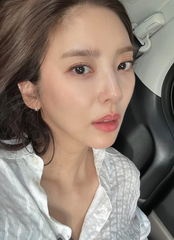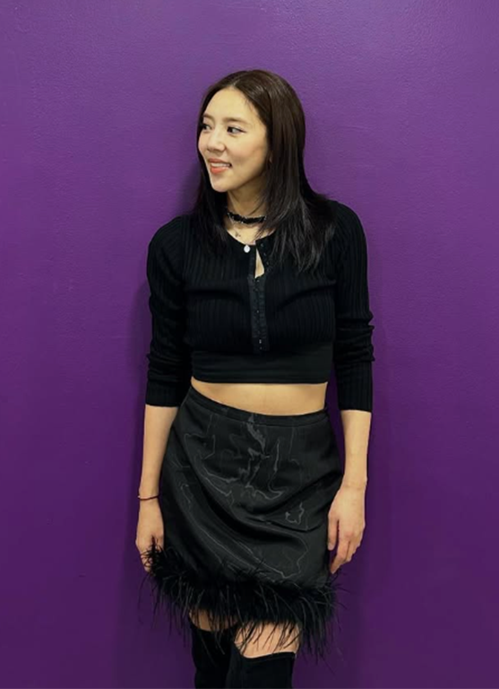 손담비는 슬림한 핏의 블랙 크롭 니트 상의에 동일한 컬러의 페더 디테일 스커트를 매치하며 절제된 스타일 속에서도 감각적인 디테일을 강조했다.