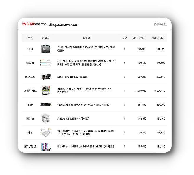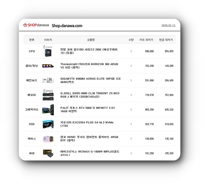 QHD 게임 환경을 고려한 윈도우 조립 PC로 게이밍 성능에 특화된 CPU와 GPU를 중심으로 구성했다. 가격은 2월 11일 기준 352만 원이다.