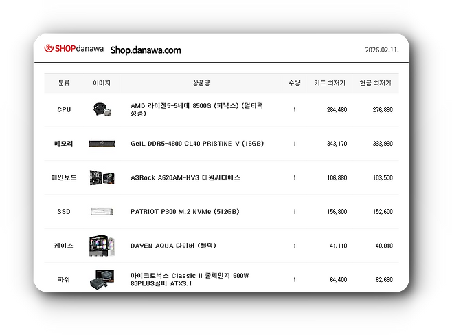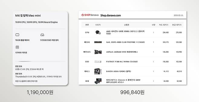 맥 미니의 비교 대상으로 AMD 라이젠 5 8000G 기반 사무용 윈도우 조립 PC를 가성비 중심으로 구성했다. RAM 16GB, SSD 512GB를 추가했고, 2월 11일 기준 약 99만 원대다.