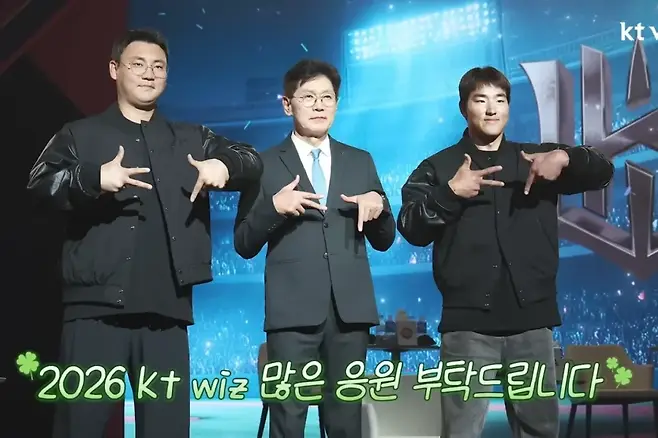 지난해 6위에 머물러 포스트시즌 진출에 실패한 KT는 올해 5위 안에 오른 뒤 한국시리즈 정상을 밟겠다는 각오다. 이강철 감독과 안현민, 장성우는 올해 우승이 목표라며 손가락 한 개를 들었다.