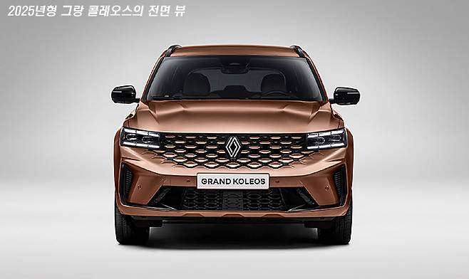 그랑 콜레오스의 전면 라디에이터 그릴은 르노의 새로운 로장쥬 엠블럼과 어울리는 육각형 다이아몬드 형태로 만들어졌습니다. 이 전면 디자인은 그랑 콜레오스 전용 디자인으로 플랫폼을 공유하고 거의 같은 구성의 지리자동차의 싱유에(Xingyue) L의 전면과는 차이를 보입니다.