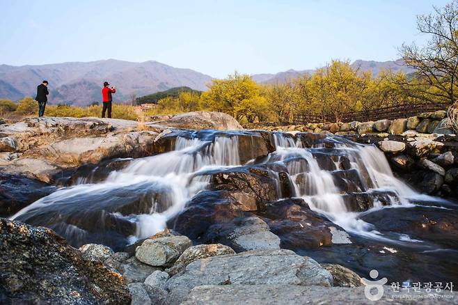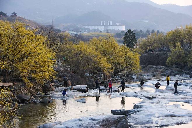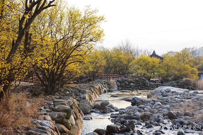햇살 아래 빛나는 노란꽃 물결과 돌담길, 맑은 계곡이 어우러지는 풍경은카메라를 꺼낼 수밖에 없는 한국적인 봄의 정취를 선물해줘요.