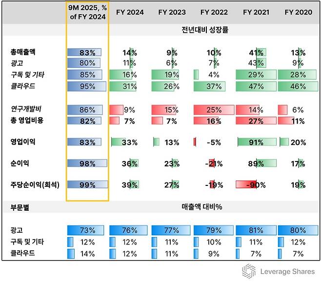 구글은 25% 성장세를 보였지만, 전년도보다 낮은 수준이었다. 다만 2020년 이후 20%대 성장률을 꾸준히 유지해왔고, 2024년은 예외적으로 높았다. 구글의 성장 안정성을 지탱한 요인은 클라우드 부문이었다. 구글 클라우드는 매출 비중이 꾸준히 늘고 있으며, 이익 기여도 역시 컸다.
