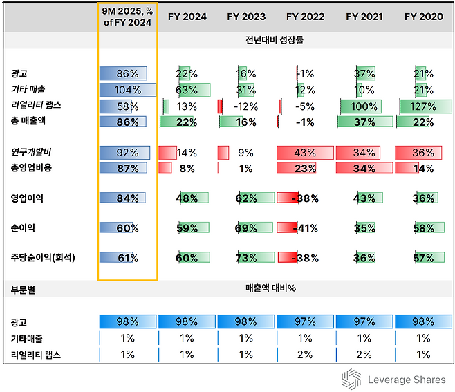 만약 2025년 9개월간의 추세가 연말까지 이어진다면, 연간 총매출은 2024년보다 약 15% 증가하고 주당순이익(EPS)은 약 19% 감소할 전망이었다. 광고 매출은 여전히 메타의 압도적인 수입원으로 남아 있으며, 왓츠앱 비즈니스나 메타 인증 서비스, 개발자 이용료를 포함한 기타 수익과 리얼리티 랩스 부문(VR 헤드셋 및 글래스)은 2020 회계연도 이후 지속적으로 전체 매출의 2% 미만에 머물렀다.