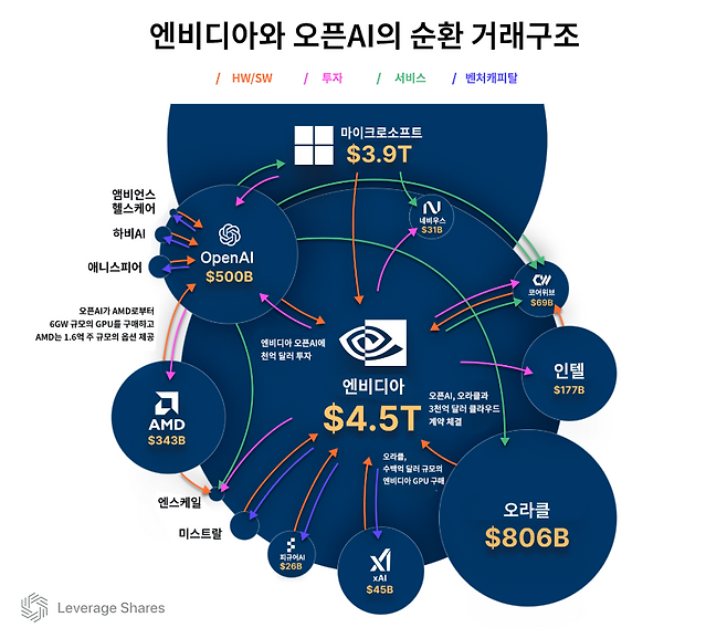 이러한 인식은 수조 달러 규모의 ‘순환 거래’ 네트워크를 만들어냈다.2 이는 엔비디아와 오픈AI를 중심으로, 투자 이후 다시 제품과 서비스를 주고받는 거래 구조를 의미했다. 현재 이 순환 구조는 미국 주요 기술기업과 AI 스타트업 대부분과 얽혀 있다.