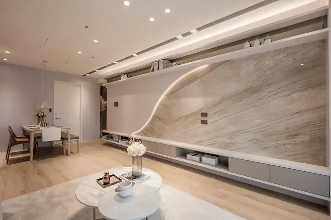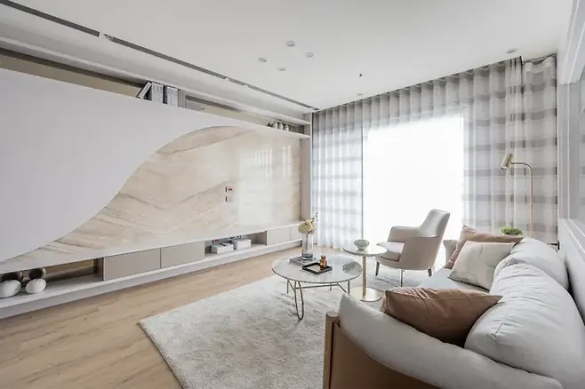 현관에서 이어지는 곡선은 거실로 자연스럽게 이동한다. 이 집 거실의 중심은 단연 부드러운 곡선의 주 벽면과 그 아래 자리한 디토나미 석재다.