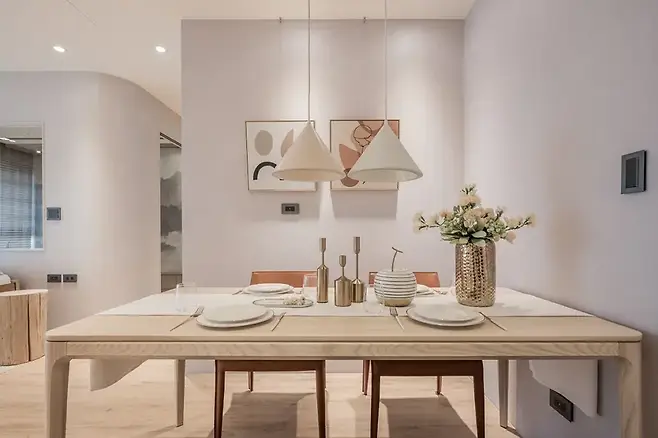 바닥재 구분선 너머에는 따스한 분위기의 식사 공간이 펼쳐진다. 톤 다운된 벽지가 단순한 페인트가 아닌, 섬세하게 쌓인 질감으로 공간을 감싸고 있다.