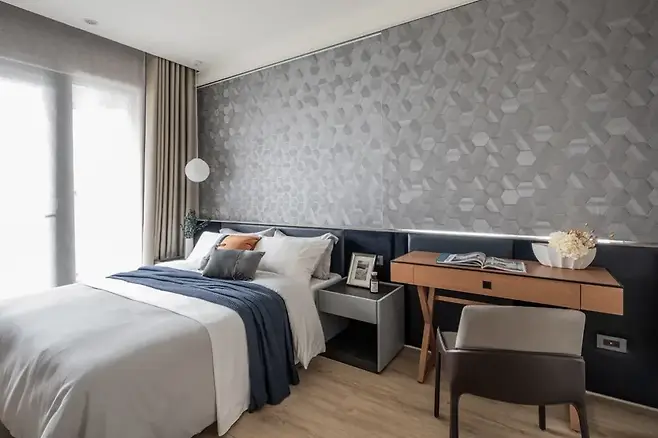 가죽 헤드보드는 포인트가 되는 동시에, 감촉적으로도 안정감을 제공한다. 명확한 색 대비와 부드러운 텍스처로 마무리된 이 방은 기능성과 감성의 균형이 잘 어우러져 있다.