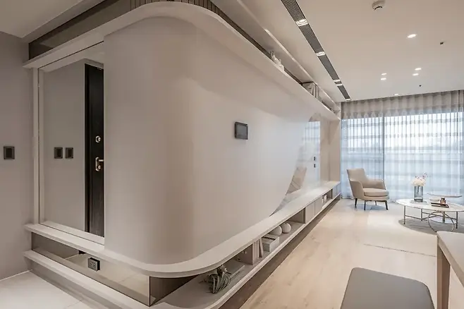 가죽 질감의 신발장이 단정한 첫인상을 살리고, 전신 거울이 놓인 작은 플랫폼은 공간에 실용성을 더한다. 여기에 곡선으로 처리된 코너는 시선을 은근히 연결하며 아침 햇살의 따스함을 초대한다.