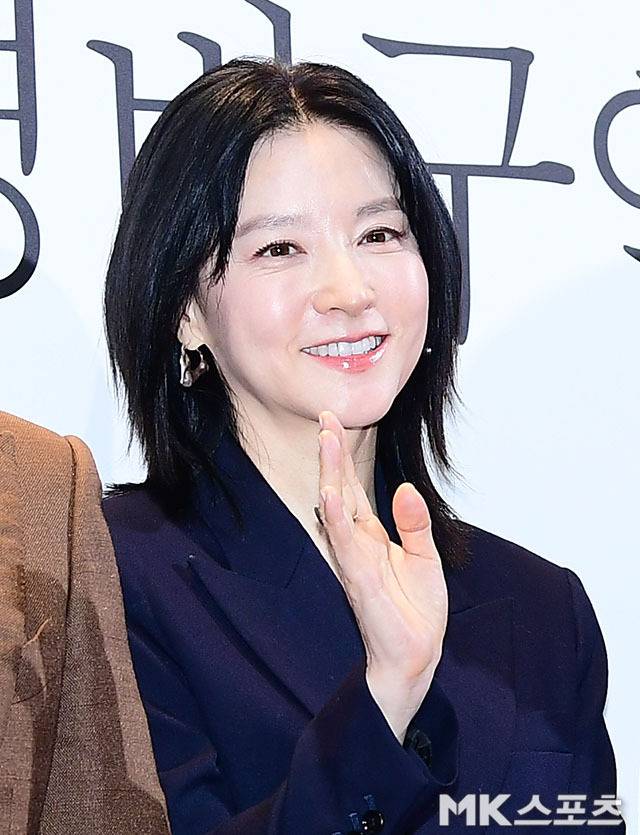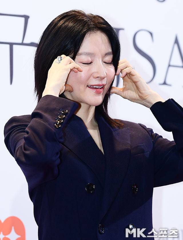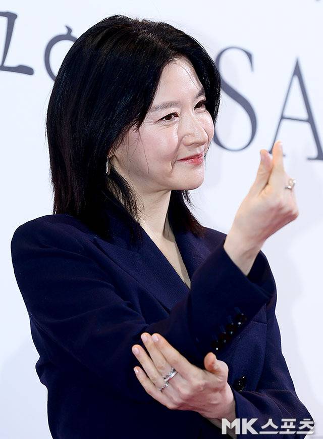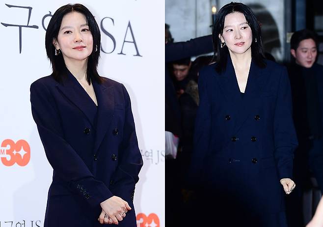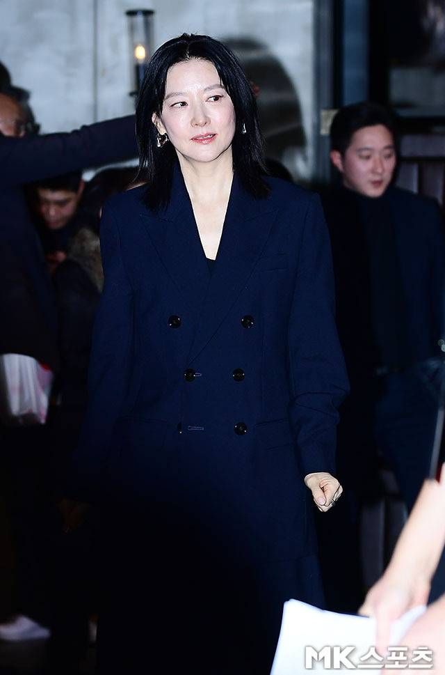 이영애는 깊은 네이비 컬러의 롱재킷과 플레어 롱스커트, 그리고 롱부츠를 매치하며 고급스러운 분위기를 자아냈다.