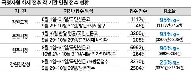 2일 본지 취재 결과, 국자원 화재로 국민신문고 시스템이 중단된 이후 9월 29일부터 지난달 31일까지 강원도청이 방문 접수로 받은 민원 건수는 25건이다. 지난달 13일부터 31일까지는 홈페이지를 통한 민원 임시 접수 창구를 운영, 이를 포함해 온라인으로 받은 민원 접수 건수는 21건이다. 화재 전인 8월 한달 간 들어온 민원 건수 1117건 대비 95% 급감했다.