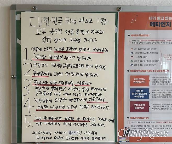 | ▲ 31일 오전 충남 영명고 학생이 학교 안에 붙인 대자보. |