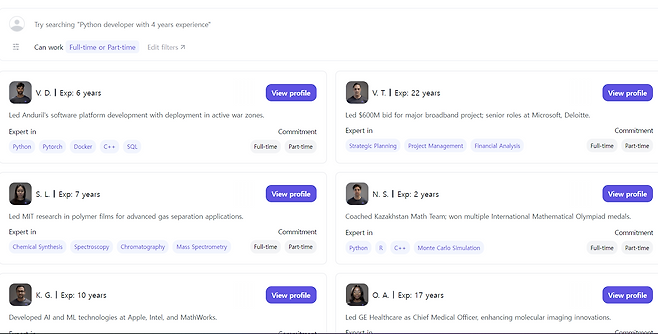 예컨대 기업 측이 '컴퓨터 비전 경험이 있는 정규직 파이썬 개발자'를 찾고 있을 경우 몇 초 만에 수십만 개의 이력서와 개인 포트폴리오 웹사이트, 트위터, AI 면접 기록 등을 제공한다.