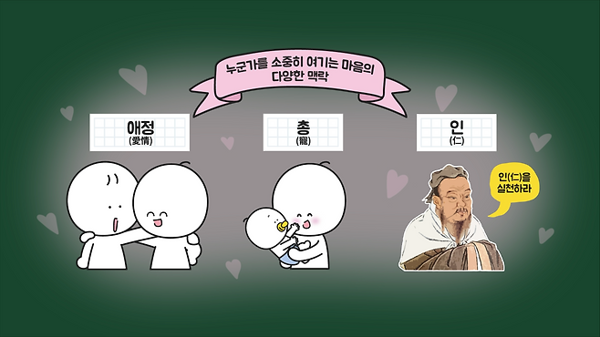 그전까지 Love는 ‘애정(愛情)’ ‘총(寵)’ ‘인(仁)’ 등으로 번역됐습니다. 이들의 의미를 살펴보면 애정은 전반적인 인간관계에서 느끼는 포괄적인 사랑을 의미하고, 총은 누군가를 특별히 귀히 여기며 돌보는 보호적 성격의 사랑을 의미합니다. 그리고 인은 유교적 미덕에서 비롯된 인간다움과 자비를 강조한 개념으로 도덕적 사랑을 의미합니다.