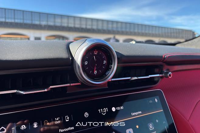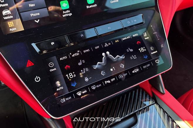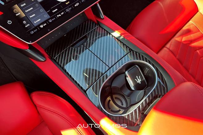 중앙에는 마세라티 상징인 원형 시계가 있는데 디지털로 표현했으며 G-포스 미터 등 다양한 기능을 입맛에 맞게 설정 할 수 있다. 센터 터널은 상대적으로 차분하다. 버튼식 변속기를 탑재한 덕분에 전부다 깔끔한 수납공간으로 채울 수 있었다. 컵홀더 높이가 다소 낮지만 이를 제외하면 전체적으로 쓰임새가 좋다.