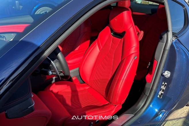 뒤는 가로로 긴 테일램프와 트렁크 중앙을 흐르는 얇은 크롬 라인, 마세라티 필기체가 어우러져 깔끔한 모습이다. 시승차는 최상위 트림인 ‘트로페오’이며 보닛에 거대한 에어덕트가 뚫어져 있고 쿼드 배기 시스템을 범퍼 양 끝에 장착했다. 군더더기 없이 모든 요소가 조화로운 외관이다.