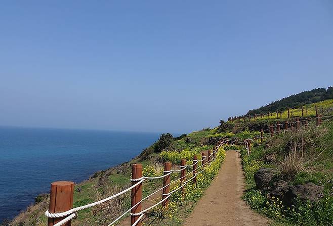 유채꽃과 에메랄드빛 해변이 어우러지는 풍경은 꼭 걷고 싶어지는 이유가 됩니다. 정상에 오르면 멀리 한라산까지 바라볼 수 있고, 봉수대와 일본군 동굴 진지 등 역사 유적도 함께 만날 수 있어요.