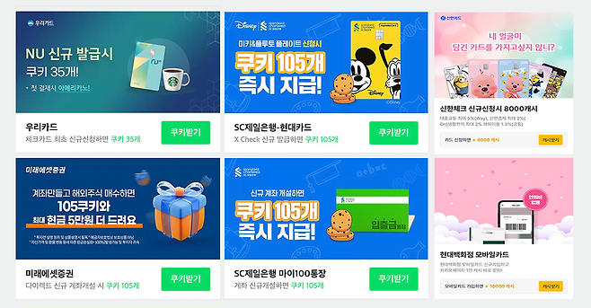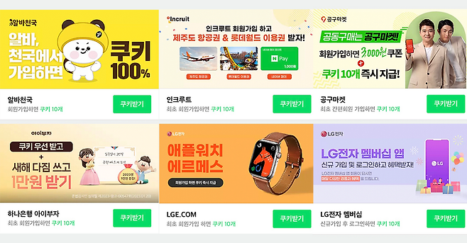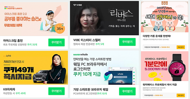 네이버 쿠키오븐은 이벤트에 참여하면 작품 미리보기에 사용할 수 있는 쿠키가 지급되는 리워드 광고 서비스예요. '무료 포인트 충전소'라고 할 수 있죠! 이 페이지에는 SNS 채널을 팔로우하거나 보험료를 조회하면 쿠키를 준다는 여러 리워드 광고가 있는데요. 원하는 광고를 선택하고 주어진 미션을 완료하면 보상으로 쿠키를 받을 수 있어요. 이렇게 쿠키오븐처럼 앱 내에 리워드 광고 목록을 보여주는 영역을 오퍼월(Offerwall)이라고 해요. 최근 여러 플랫폼은 잠재 유저와 수익을 확보하기 위해 오퍼월을 이용한 광고를 마케팅 수단으로 활용하고 있어요.