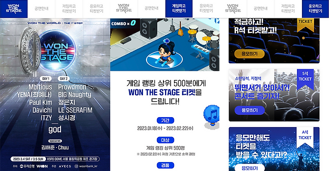 우리은행은 다음 달 3월 WON THE STAGE라는 콘서트를 개최해요. 이틀 동안 힙합, 발라드, 아이돌 등 다양한 장르의 아티스트가 무대를 선보일 예정인데요. 보통 콘서트 티켓은 돈을 주고 구매하잖아요. 근데 특이하게 이 콘서트의 티켓은 우리은행 앱에 접속해서 이벤트를 참여해야만 얻을 수 있다는 것이에요! 🎫