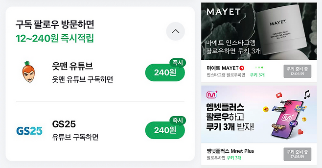 콘텐츠를 구독하거나 SNS 팔로우를 하면 리워드를 지급해요.